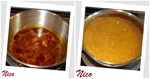 Separat, se topeste intr-o cratita restul de zahar peste care turnam cind am obtinut caramelul, compozitia de mai sus. Amestecam si lasam pe foc pina se topesc bucatile de caramel ce se formeaza. La sfarsit adaugam esenta de rom. Lasam la racit pentru 30 minute.