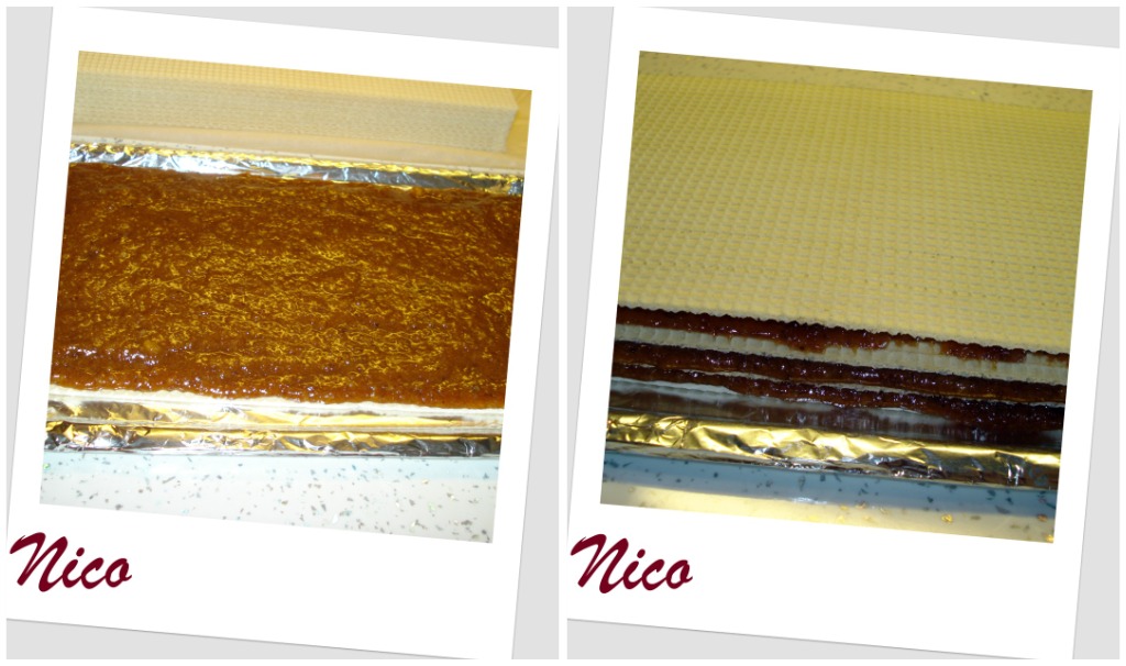 Am nivelat bine si asezat inca o foaie napolitana pe care am presat-o usor. Procedam asa pina cind terminam crema. Eu am folosit numai 4 foi de napolitana, iar prajitura a avut o inaltime medie.